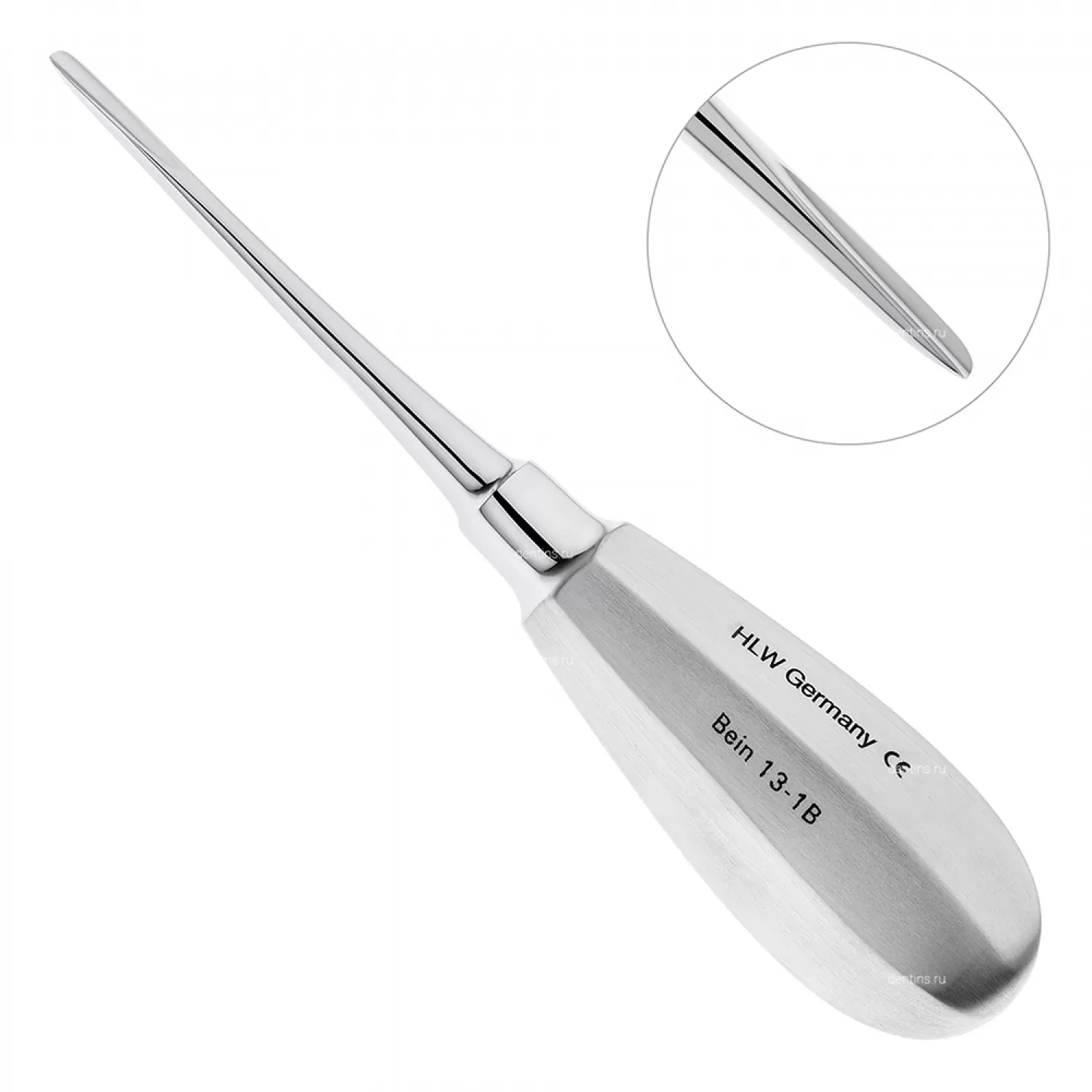 Для удаления корней и зубов на верхней и нижней челюсти применяется элеватор конструкции Бейна производства немецкой компании HLW Dental Instruments.