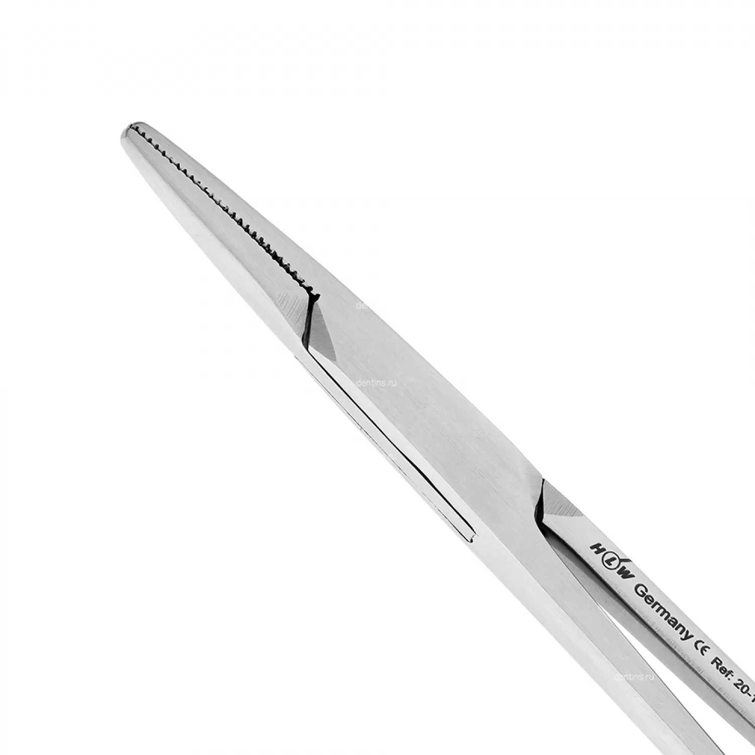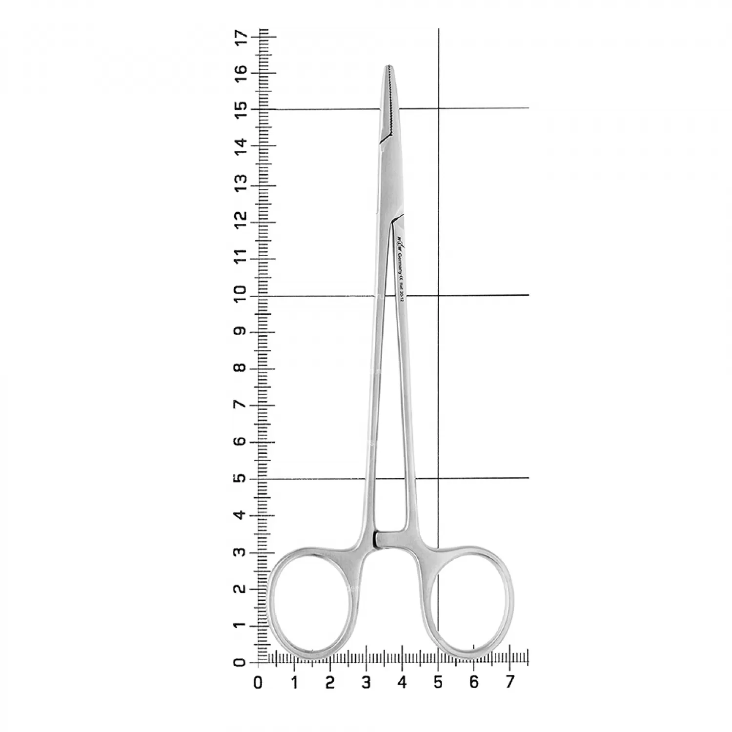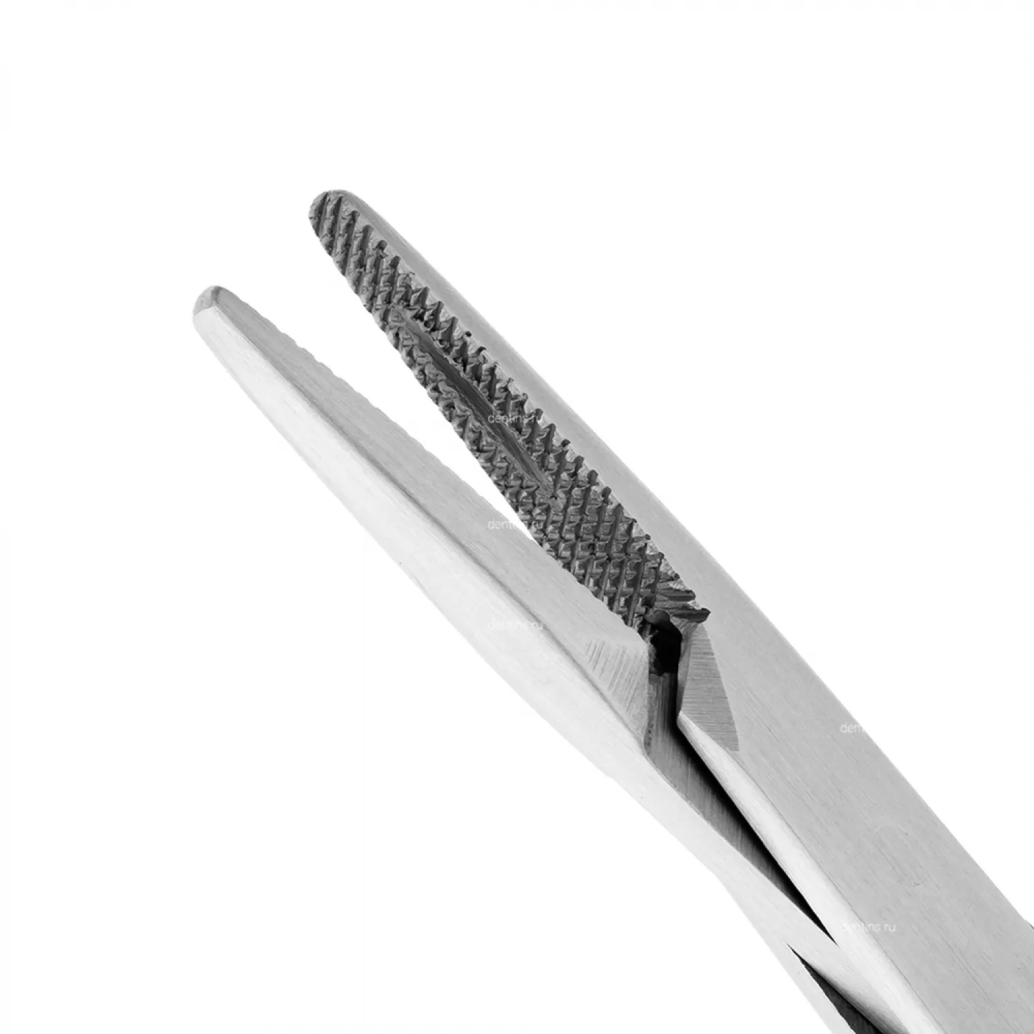 Внутренние рабочие поверхности иглодержателя имеют крестообразные насечки и небольшое углубление в центре. Такая конструкция щечек обеспечивает надежную фиксацию инструмента на плоскости хирургической иглы при наложении шва. Рабочие концы инструмента короткие, массивные и тупоконечные, что упрощает захват и освобождение иглы, а также способствует точному проведению иглы на всех стадиях наложения швов.