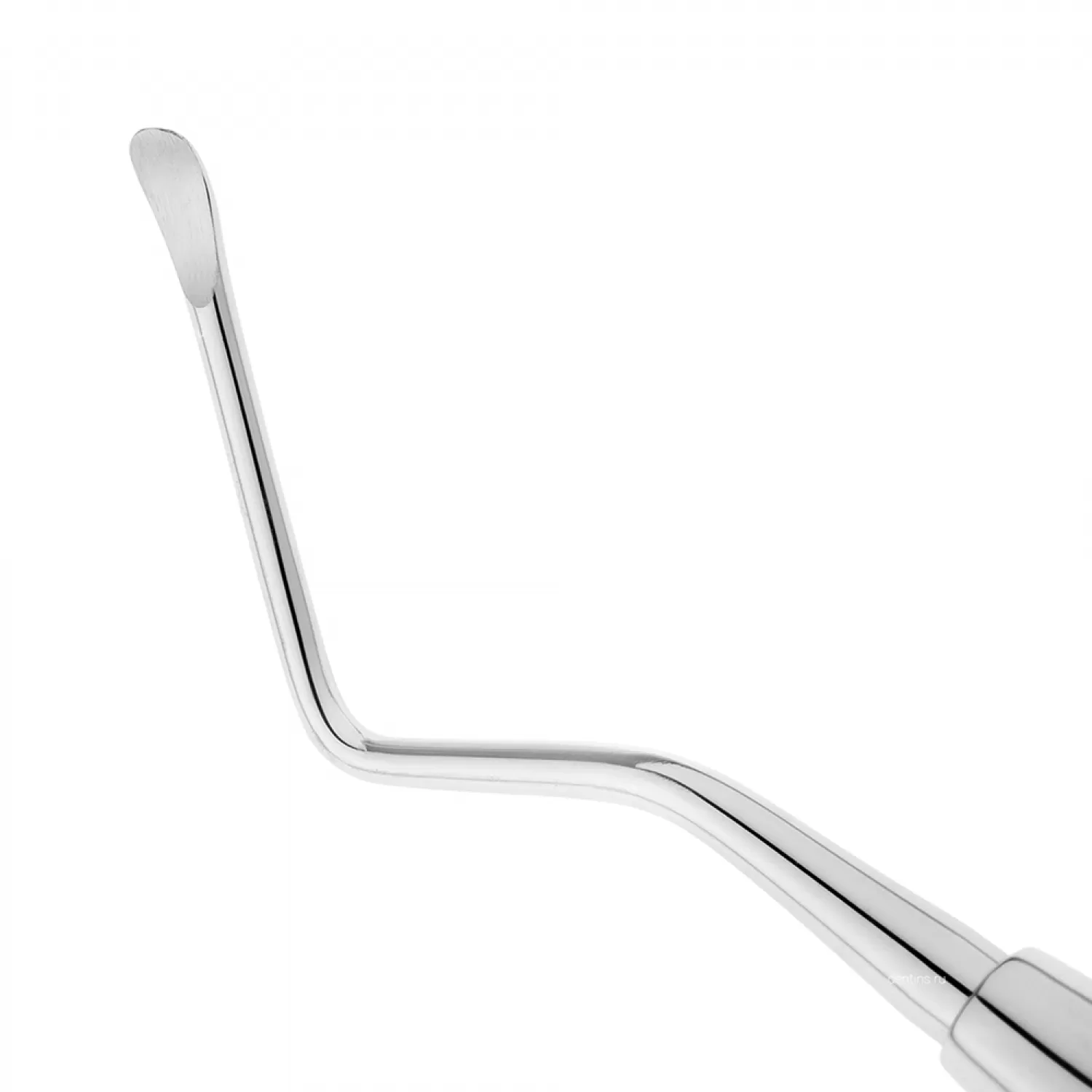 Ручка инструмента двусторонняя. С обоих концов рукоятки расположены зеркально отраженные рабочие части шириной по 2 мм каждая. Кончики рабочих частей кюретажной ложки представляют собой слегка изогнутые плоскости каплевидных форм с острыми гранями. Такая конструкция инструмента позволяет выскабливать пораженную костную ткань и эффективно удалять грануляции из лунок удаленных зубов.