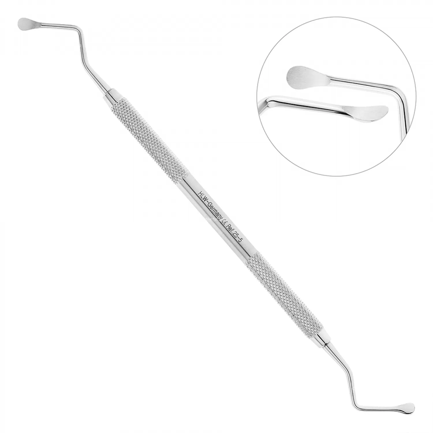 Кюретажная ложка Lukas (Лукаса) торговой марки HLW Dental Instruments применяется в хирургической стоматологии для удаления мелких фрагментов из лунки, а также кюретажа грануляционных тканей. Ручка инструмента двусторонняя. С обоих концов рукоятки расположены зеркально отраженные рабочие части шириной по 4 мм каждая. Кончики рабочих частей кюретажной ложки представляют собой слегка изогнутые плоскости каплевидных форм с острыми гранями. Такая конструкция инструмента позволяет выскабливать пораженную костную ткань и эффективно удалять грануляции из лунок удаленных зубов.