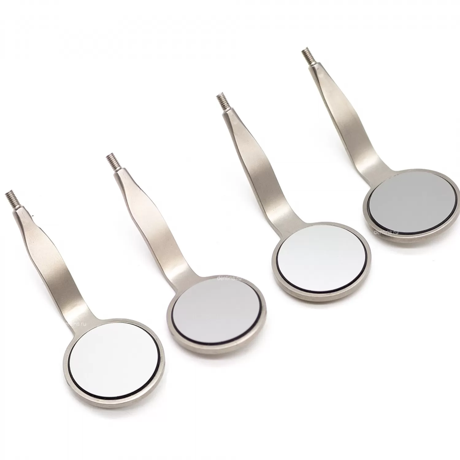 В набор входит 4 ультраярких зеркала с родиевой передней отражающей поверхностью. Отлично подходят для работы с увеличением и микроскопом. Особенность данной модели - наличие зеркал с наружной и внутренней стороны, а также особая рабочая часть, которой можно отодвигать слизистую.