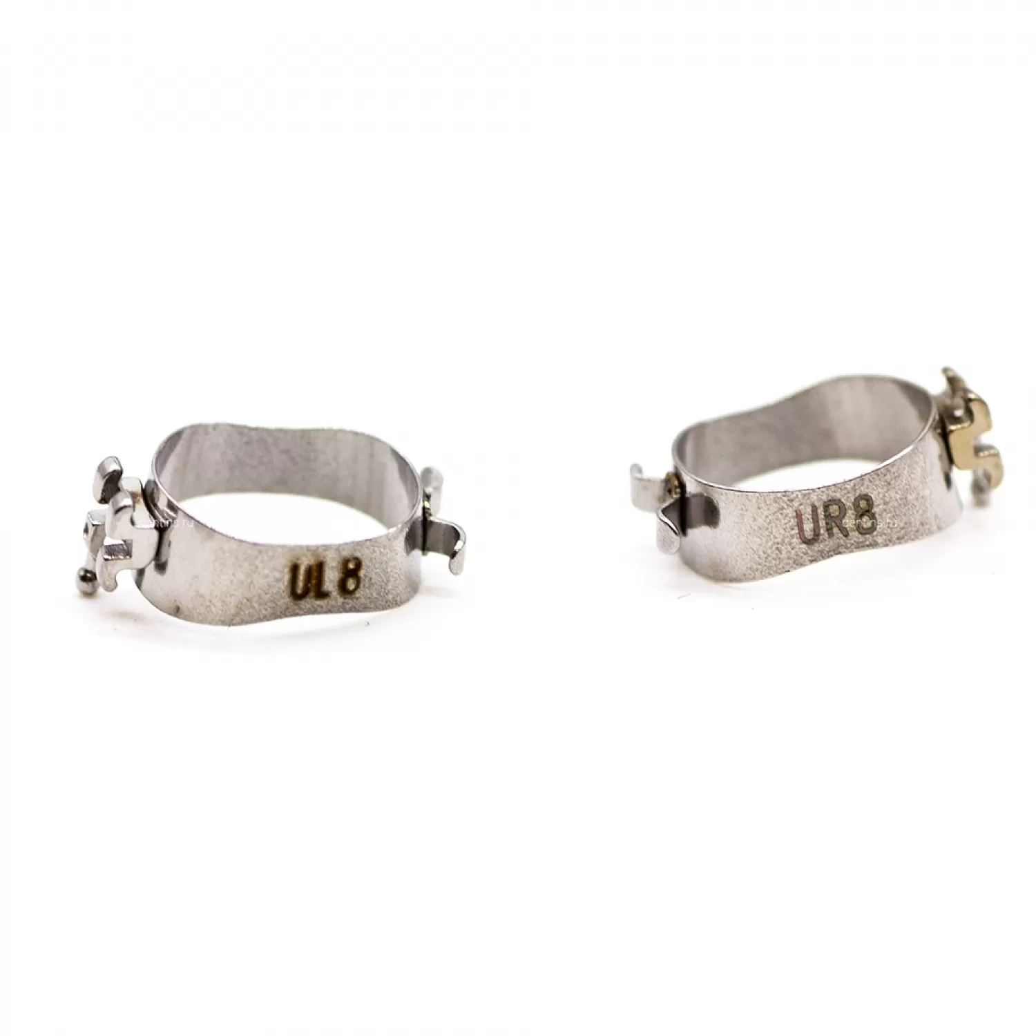 На вестибулярной стороне кольца плотно припаян паз для дуги, а с внутренней стороны есть крючки для доп элементов (эластические цепочки и тяги).