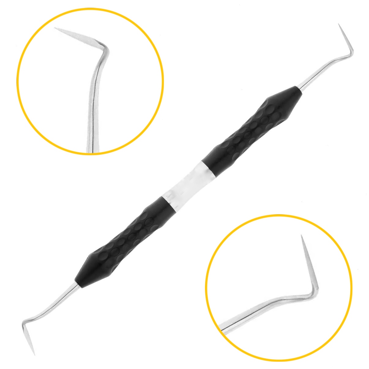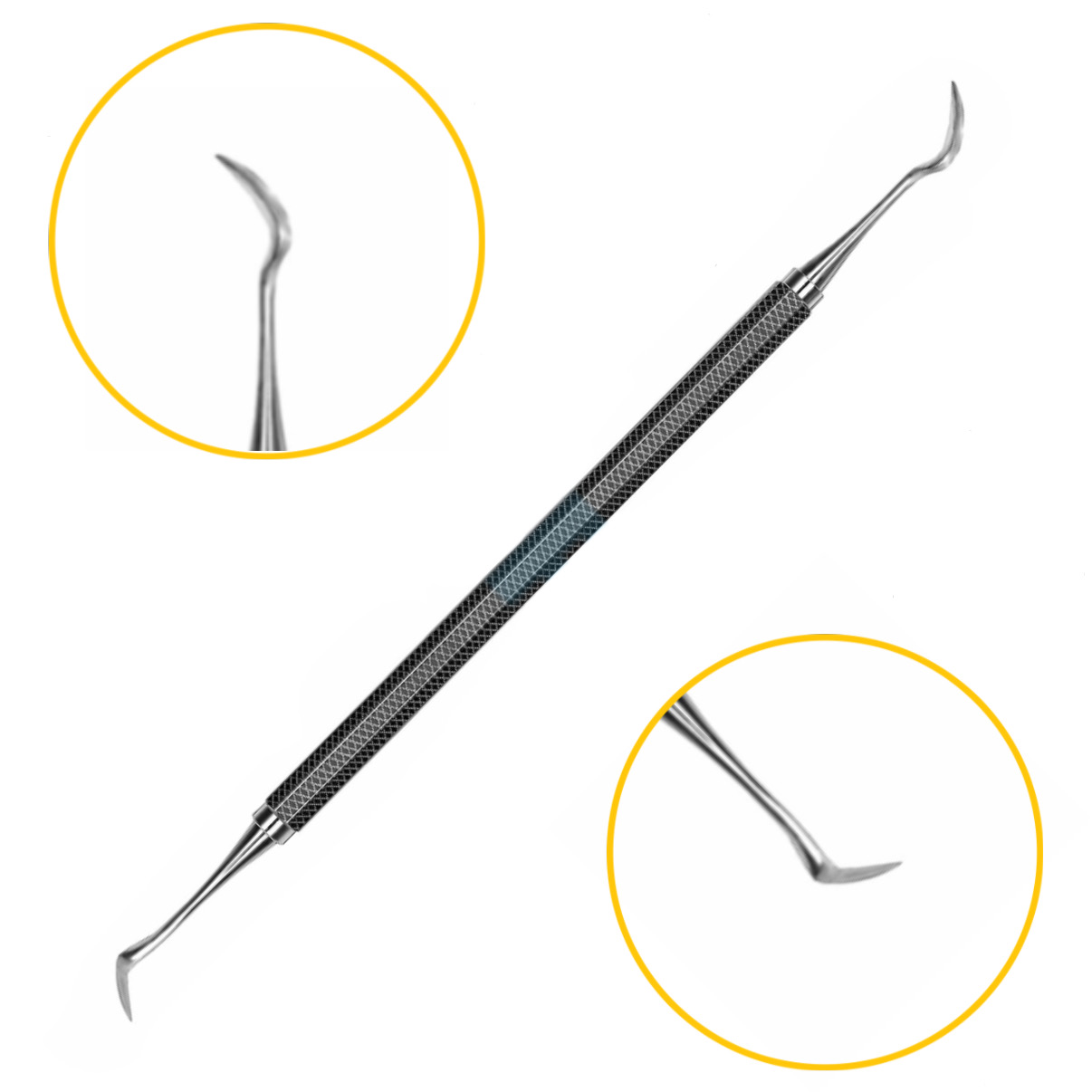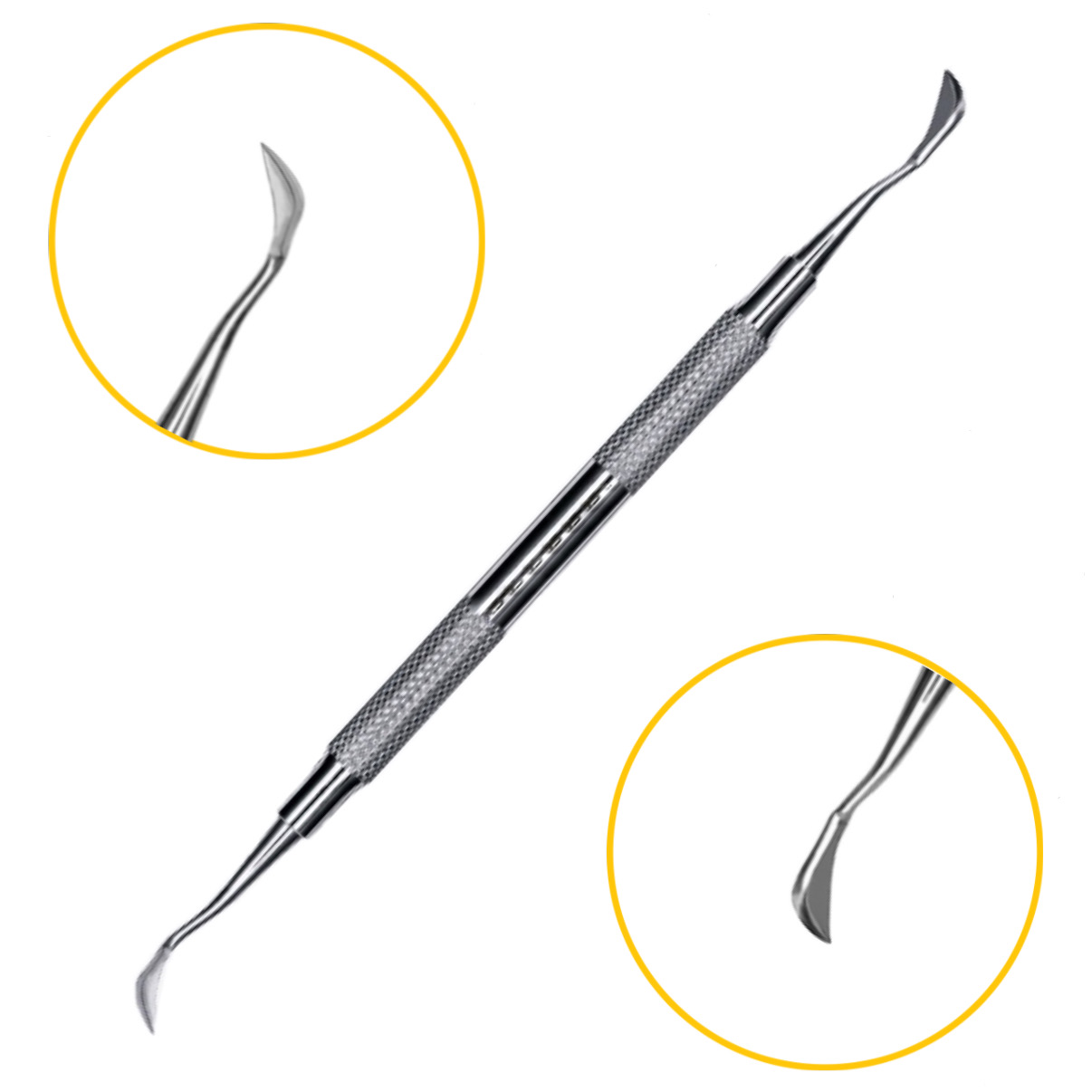В этот список также необходимо добавить серповидную гладилку с заостренными краями. Она применяется для отслаивания периодонта перед удалением зуба. Конструктивная особенность инструмента заключается в двусторонней заточке рабочих граней. Первая рабочая часть выполнена в форме изогнутого серпа, а вторая имеет форму прямоугольника с закругленными углами. Изгиб стержня обеспечивает удобный доступ к аппроксимальным зонам.