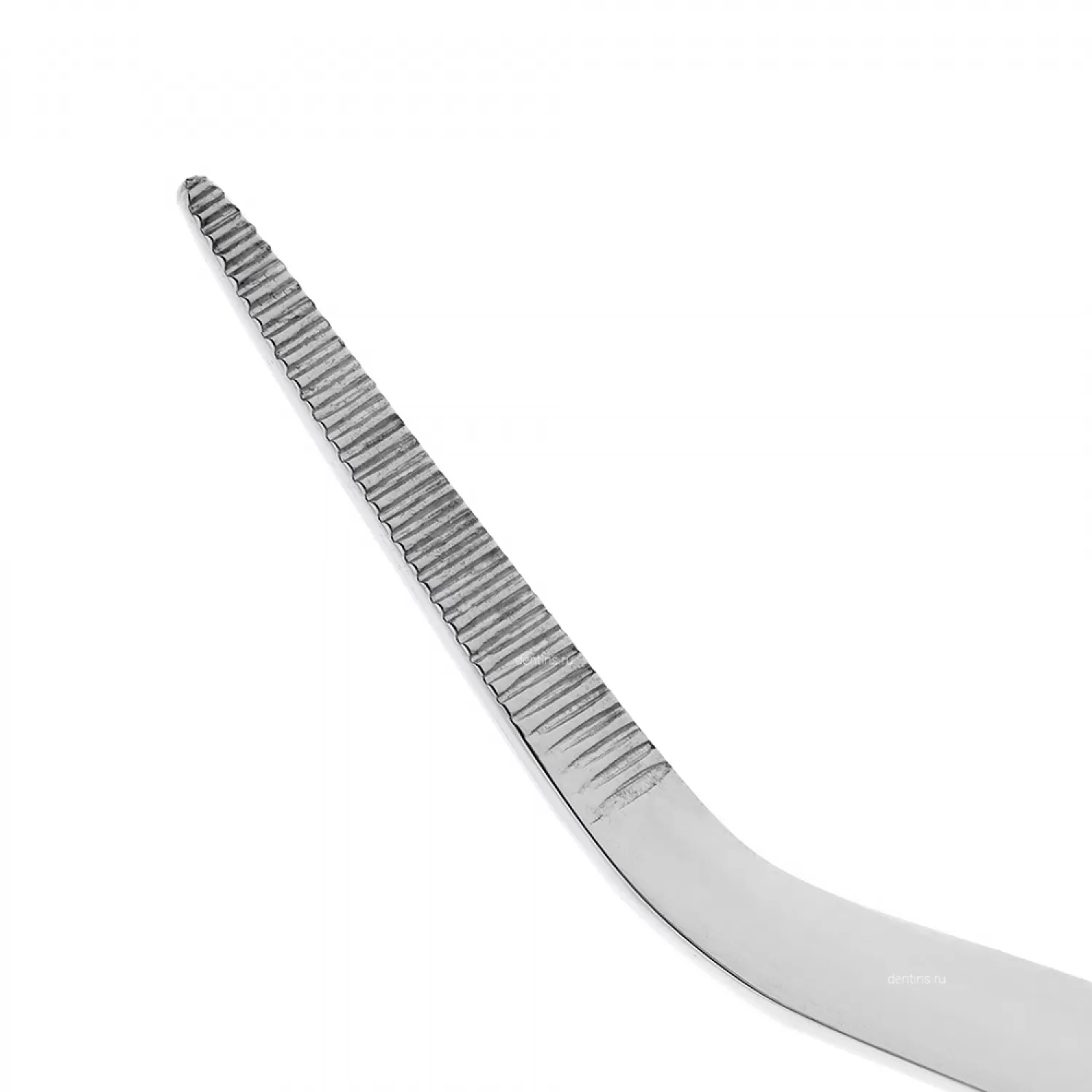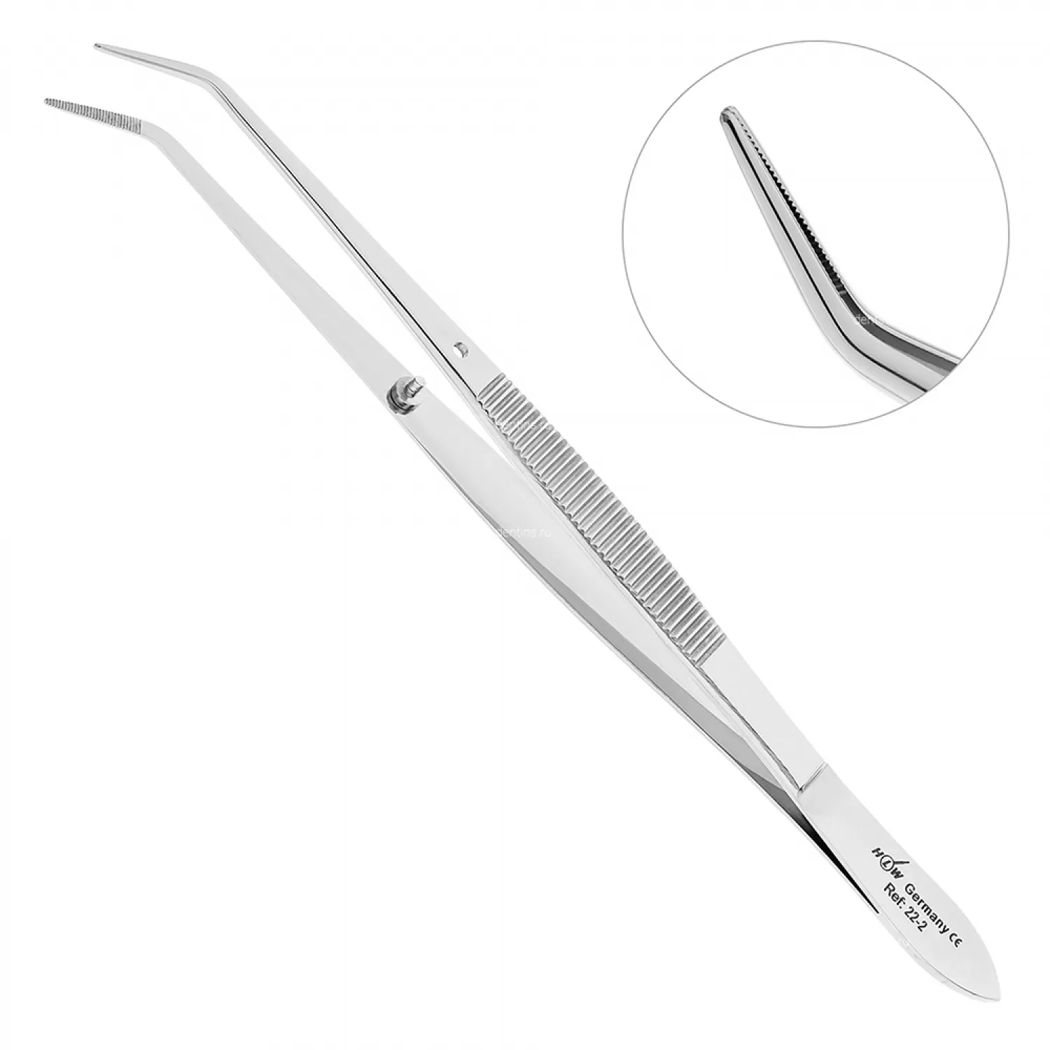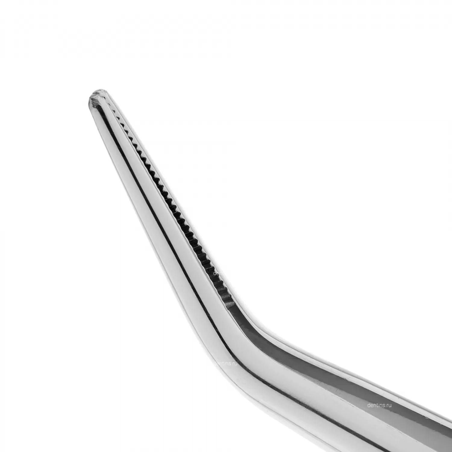 Рабочая часть пинцета имеет изгиб по плоскости, что способствует введению микро пинцета в глубокие и труднодоступные участки полости рта. Внутренние поверхности браншей инструмента имеют поперечные насечки для деликатного захвата и удерживания мягких тканей в ротовой полости.