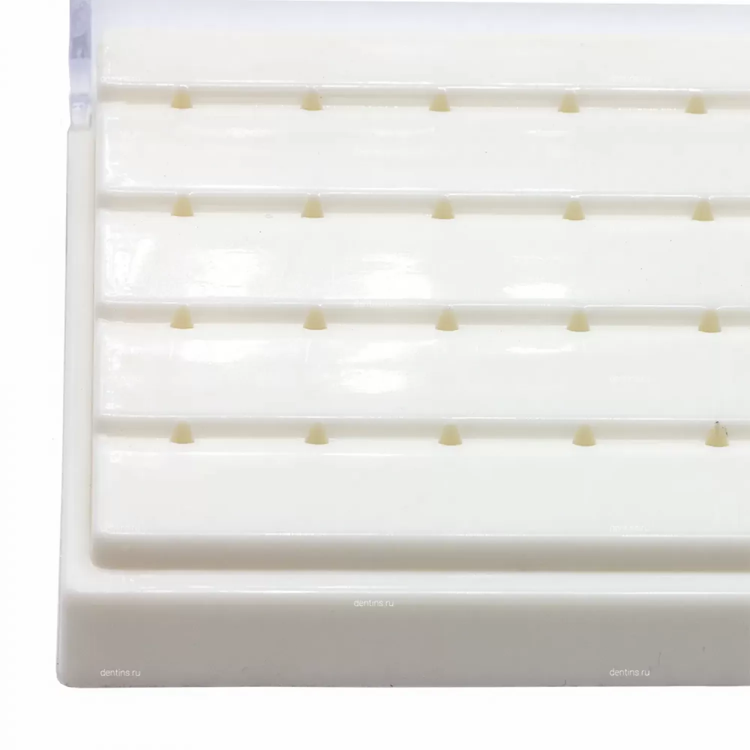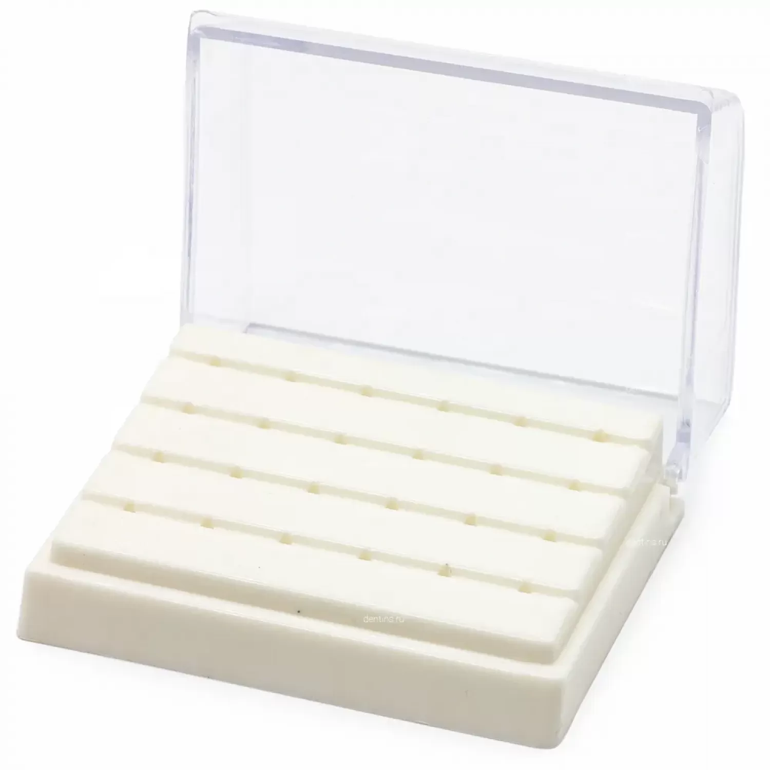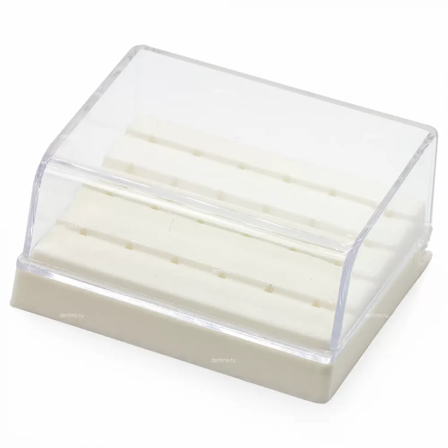 Белая подставка имеет компактный размер и прозрачную крышку для комфортного использования и визуального доступа к борам.