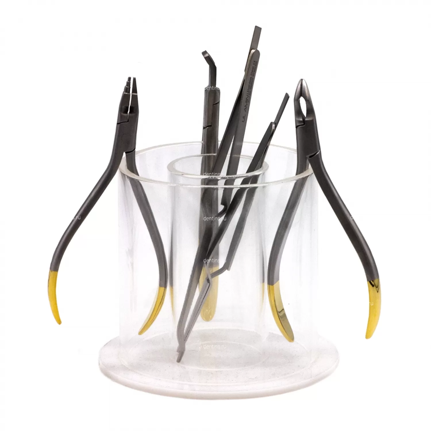 Подставка для ортодонтических инструментов из орг. стекла. Имеет внешний цилиндр для навешивания щицов, а также внутренний цилиндр для стержневых инструментов и зажимов.