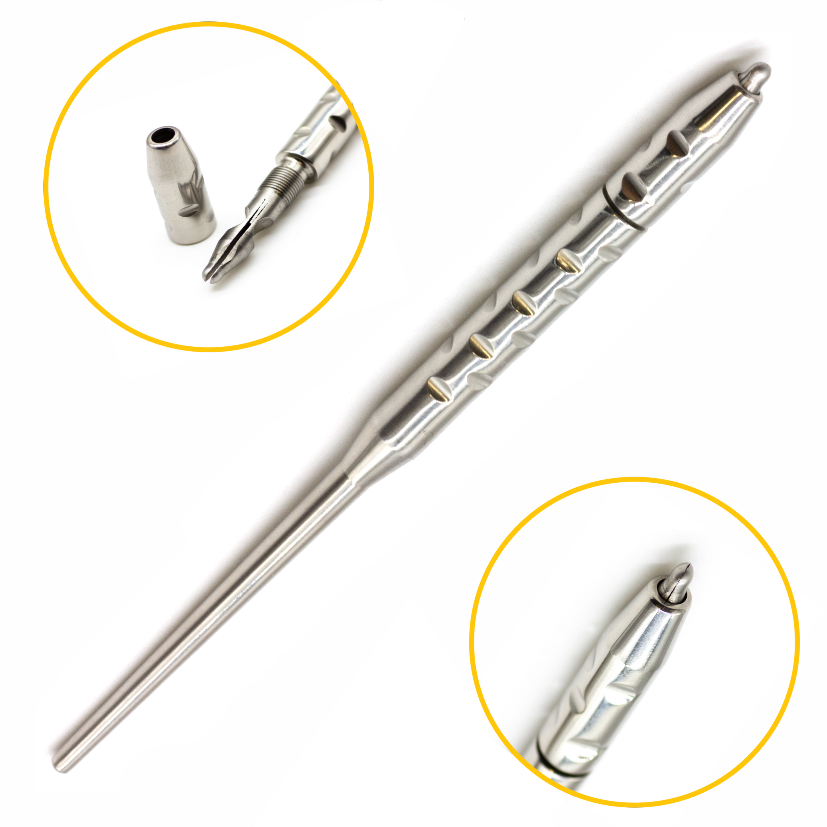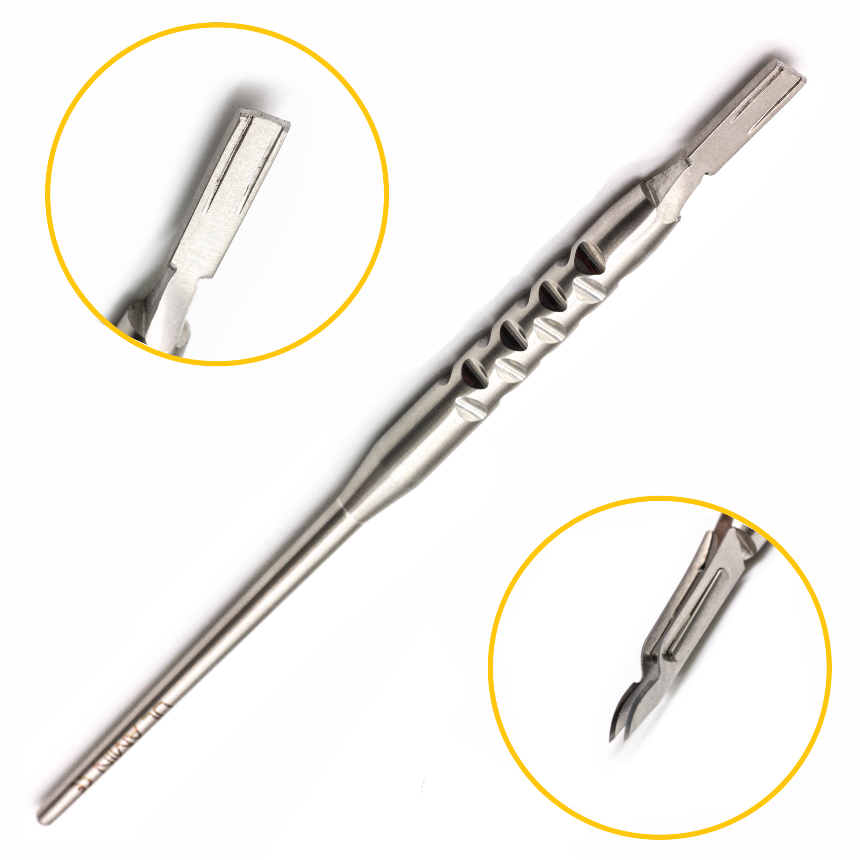 Ручка для микролезвий отличается круглой формой, напоминающей перо. Для надежной фиксации лезвие вставляется в выемку рабочей части и зажимается с помощью цангового механизма (колесика). Для данной ручки используются специальные микролезвия, шириной 3,5 мм.