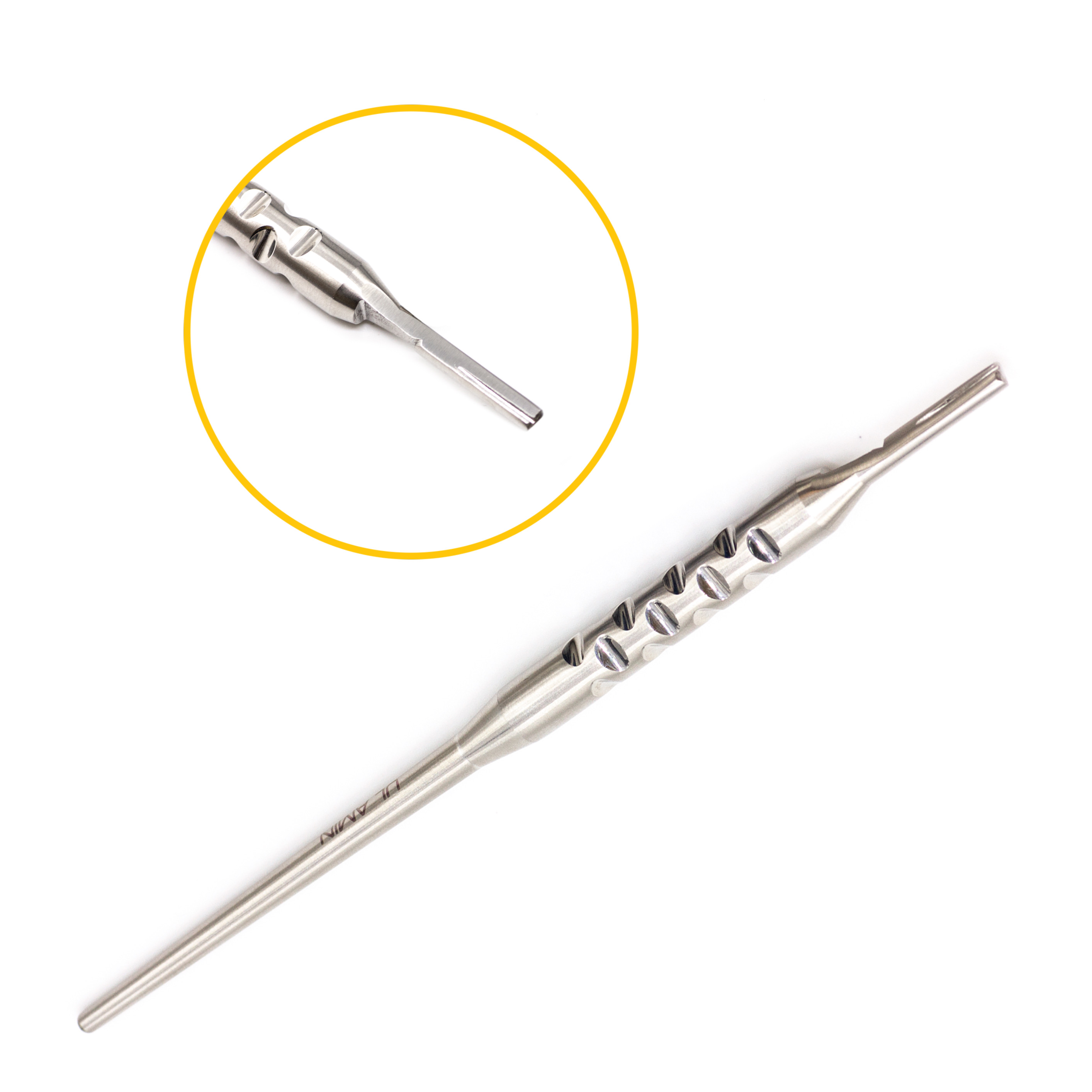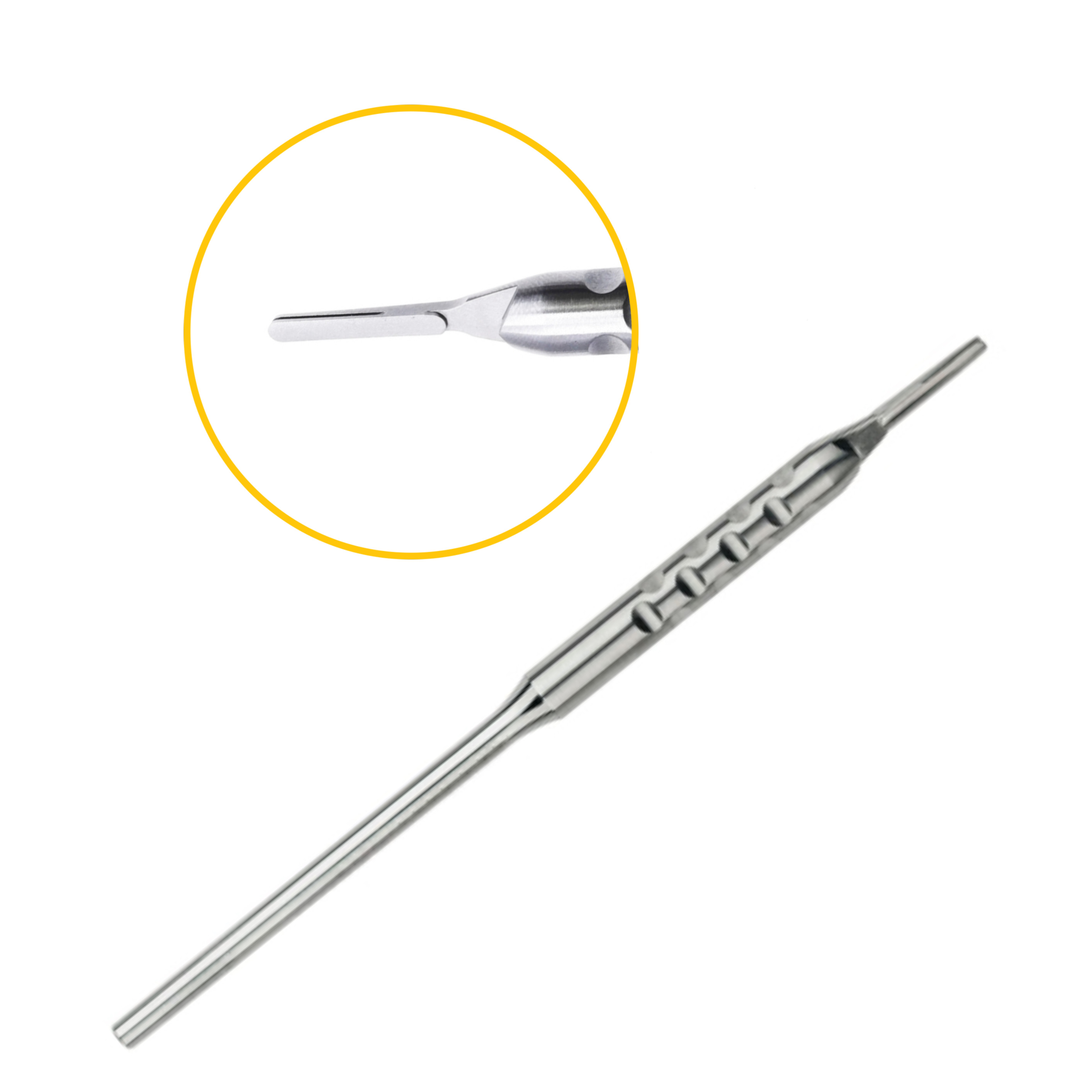 Регулируемая рукоятка для скальпеля занимает особое место в хирургическом арсенале. Ее ключевая особенность - возможность менять угол наклона зафиксированного лезвия относительно рукоятки. Инструмент поддерживает регулировку в семи плоскостях, что позволяет врачу держать руку в естественном положении независимо от направления разреза. Такая рукоятка незаменима при работе в труднодоступных зонах, в частности при заборе трансплантата с неба и манипуляциях в ретромолярной области.