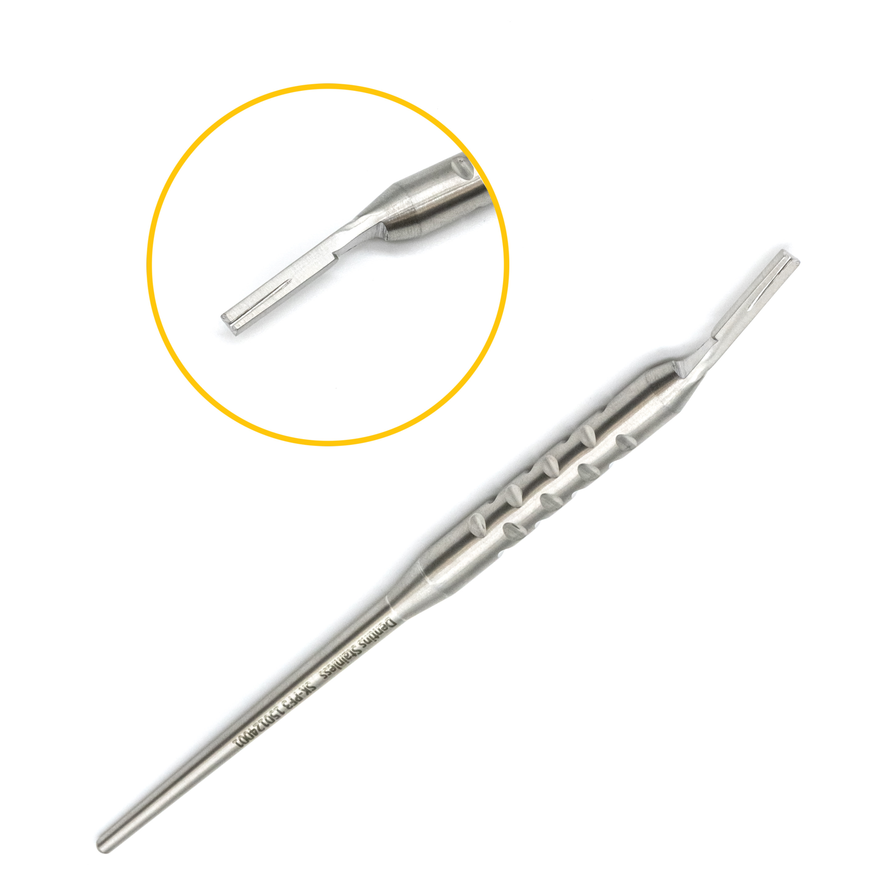 Ручка для скальпеля - это металлический инструмент, предназначенный для надежной фиксации лезвия при работе в полости рта. Конструкция включает два основных элемента: рукоятку и рабочую часть. Рукоятка обычно имеет прямую форму с фрезерованной поверхностью, что повышает маневренность инструмента и снижает утомляемость рук врача, обеспечивая комфорт и эффективность во время операций. Рабочая часть может быть прямой или изогнутой - выбор зависит от специфики манипуляций. Лезвие крепится и фиксируется на конце рабочей части.
