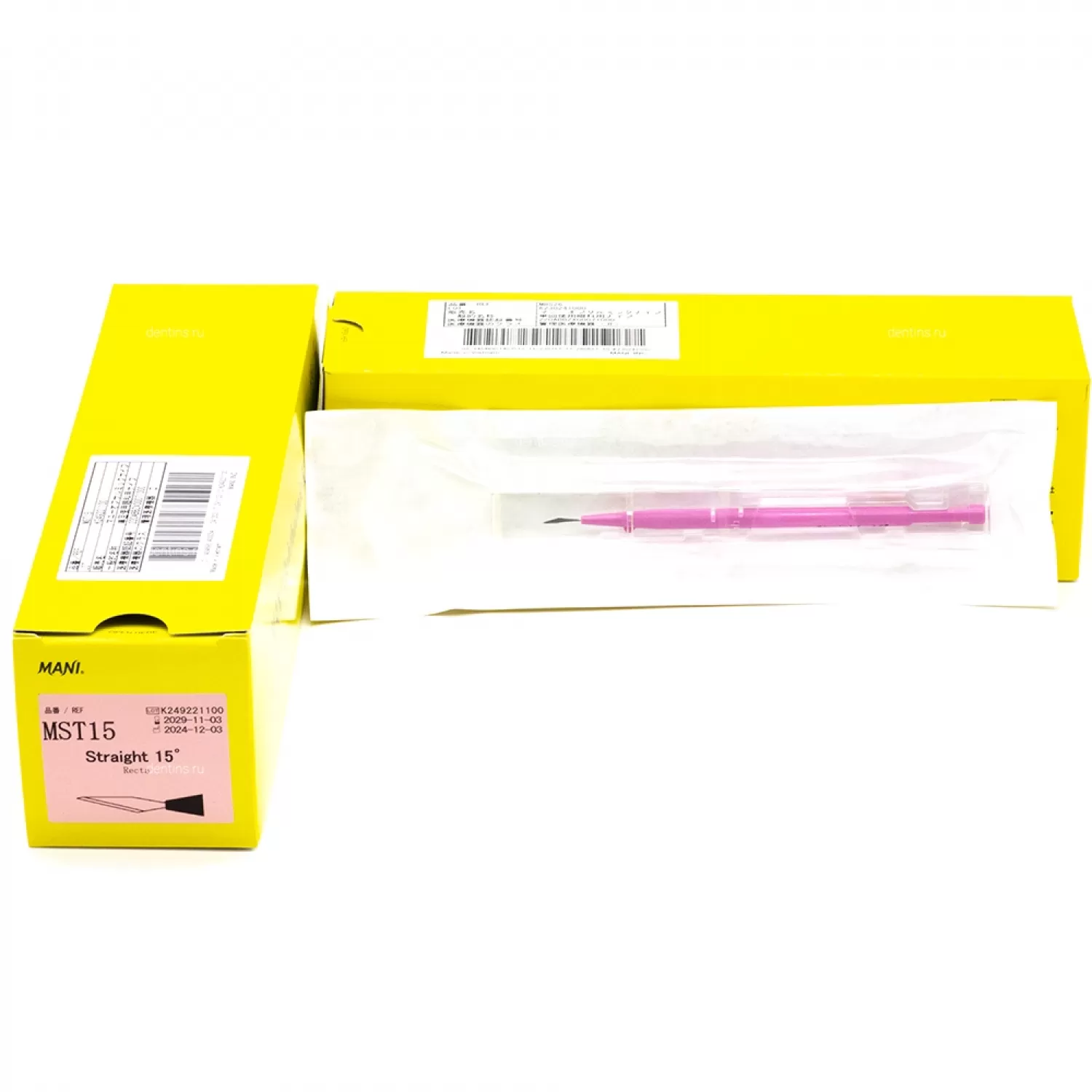В набор входит скальпель-расслаиватель микрохирургический, офтальмологический с одной режущей кромкой Mani, 1,5 мм - 1 шт.