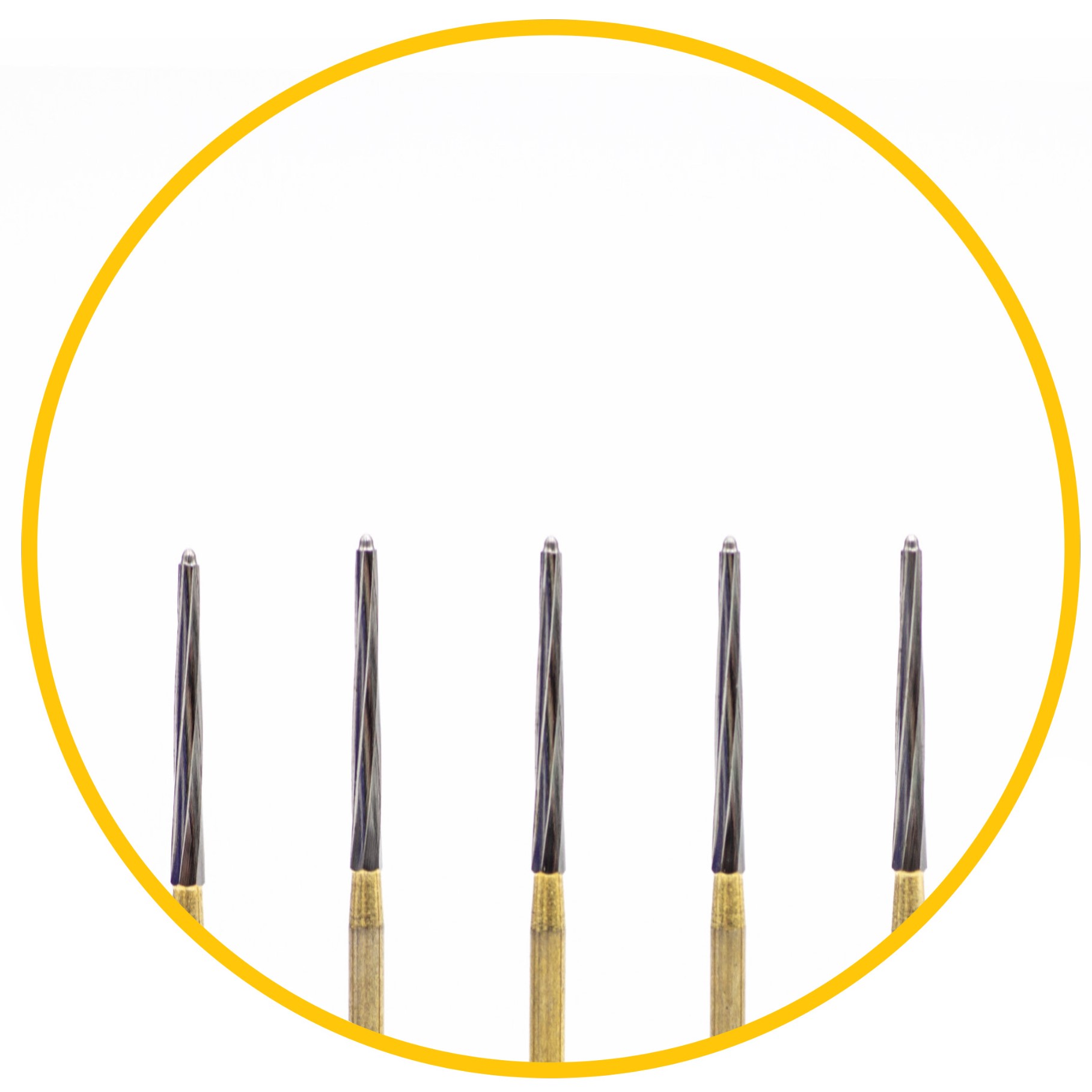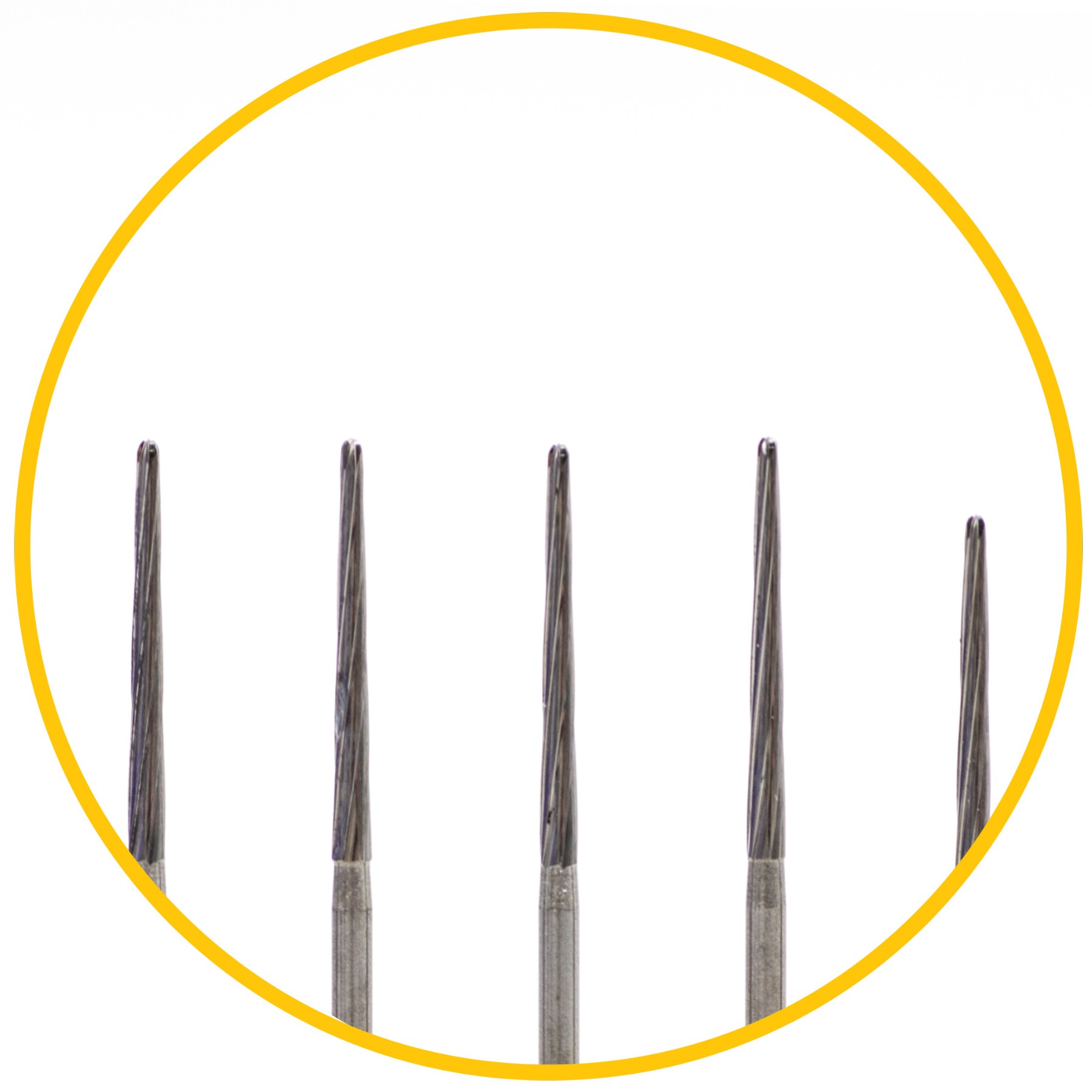 Твердосплавные боры производятся с использованием карбида вольфрама - материала, отличающегося исключительной прочностью и твердостью. Ключевыми преимуществами материала являются высокая рабочая скорость инструмента и сниженный уровень вибрации. Такие боры оптимальным для деликатного препарирования дентина, а также для точечного удаления устаревших пломбировочных материалов.