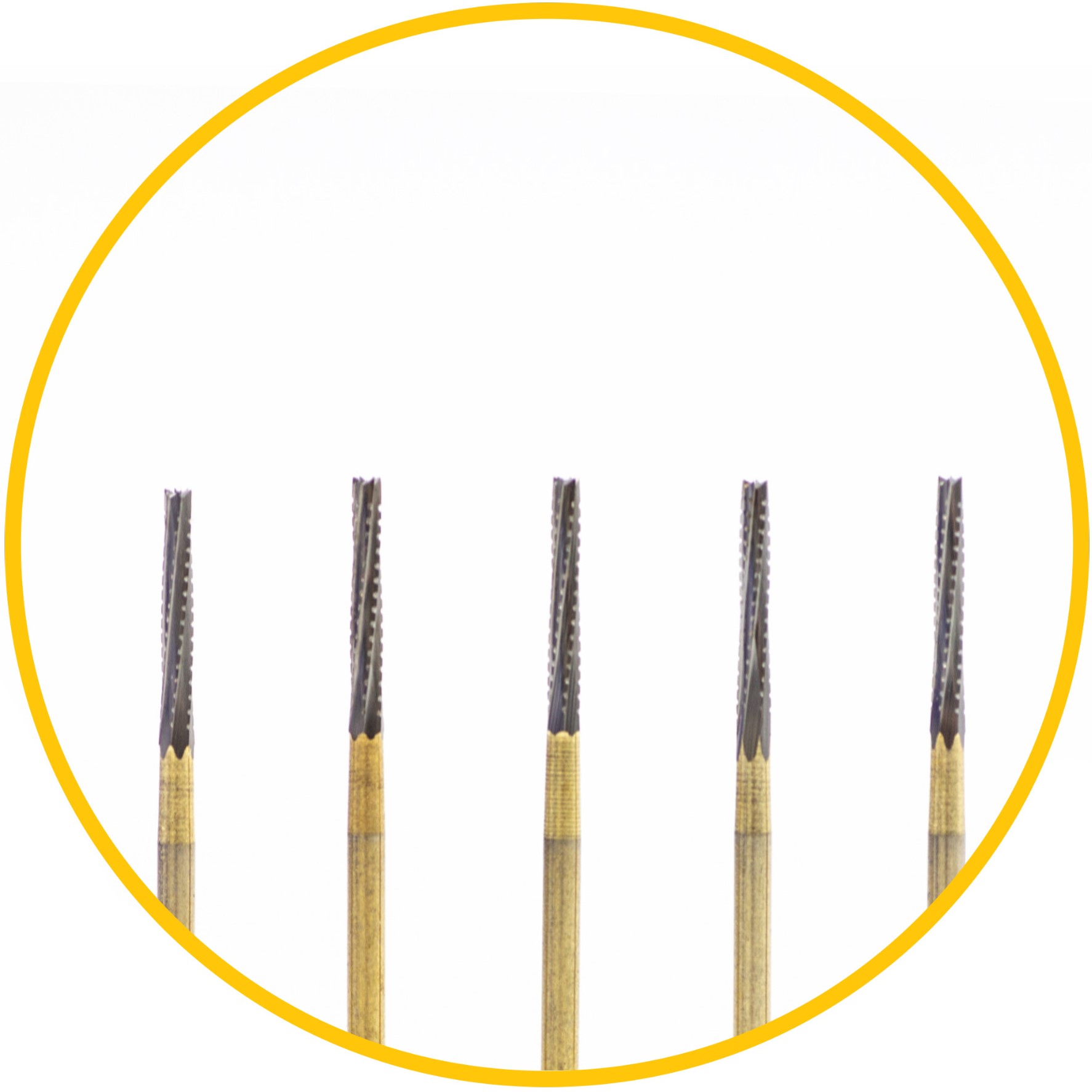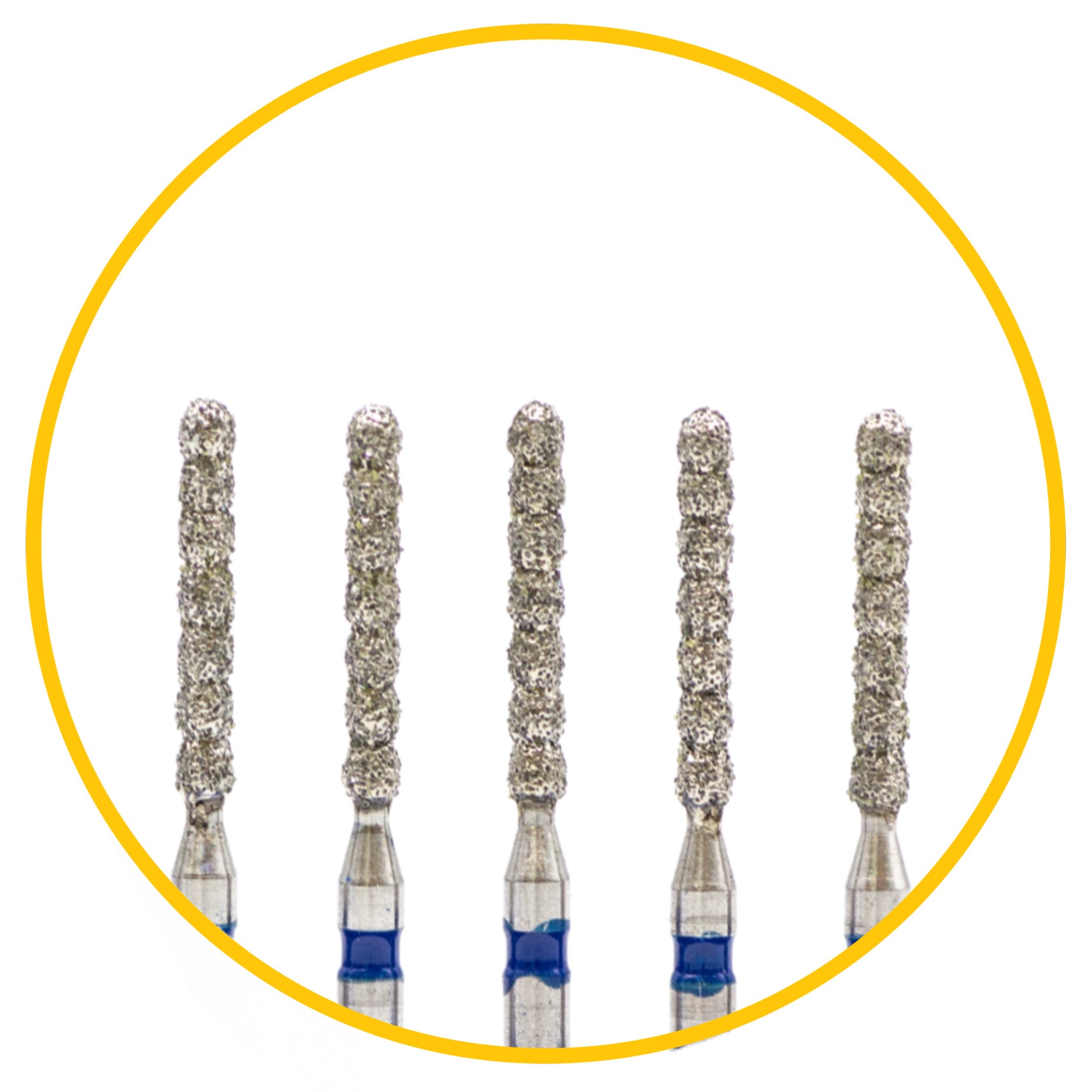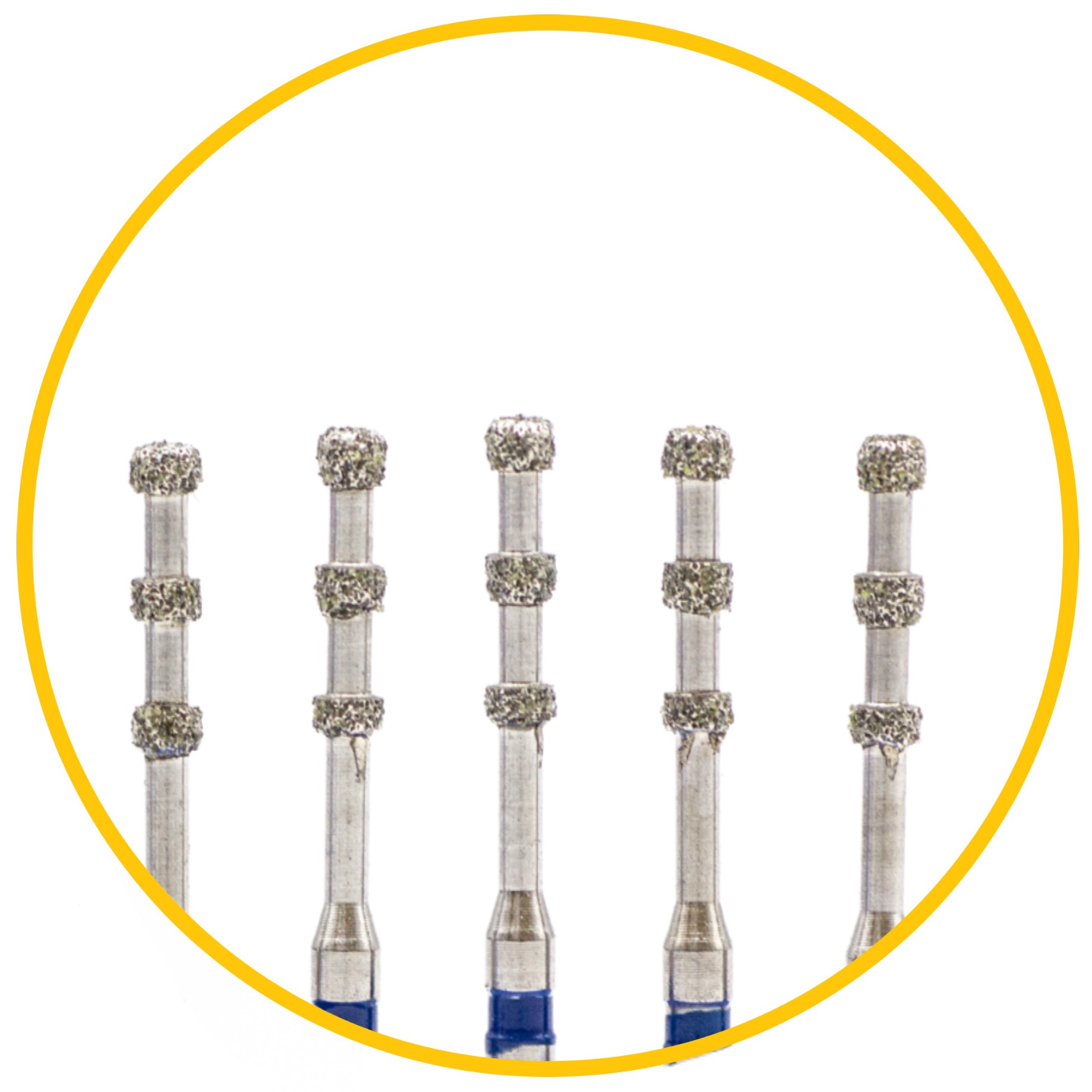 Боры для редукции эмали и дентина предназначены для оперативного препарирования твердых тканей зуба. Инструмент позволяет скалывать и резать структуру зуба, обеспечивая контролируемое удаление дентина. Конструктивно рабочая часть выполнена в вытянутой ребристой форме, визуально напоминающей плотно соединенные друг с другом сферические элементы.