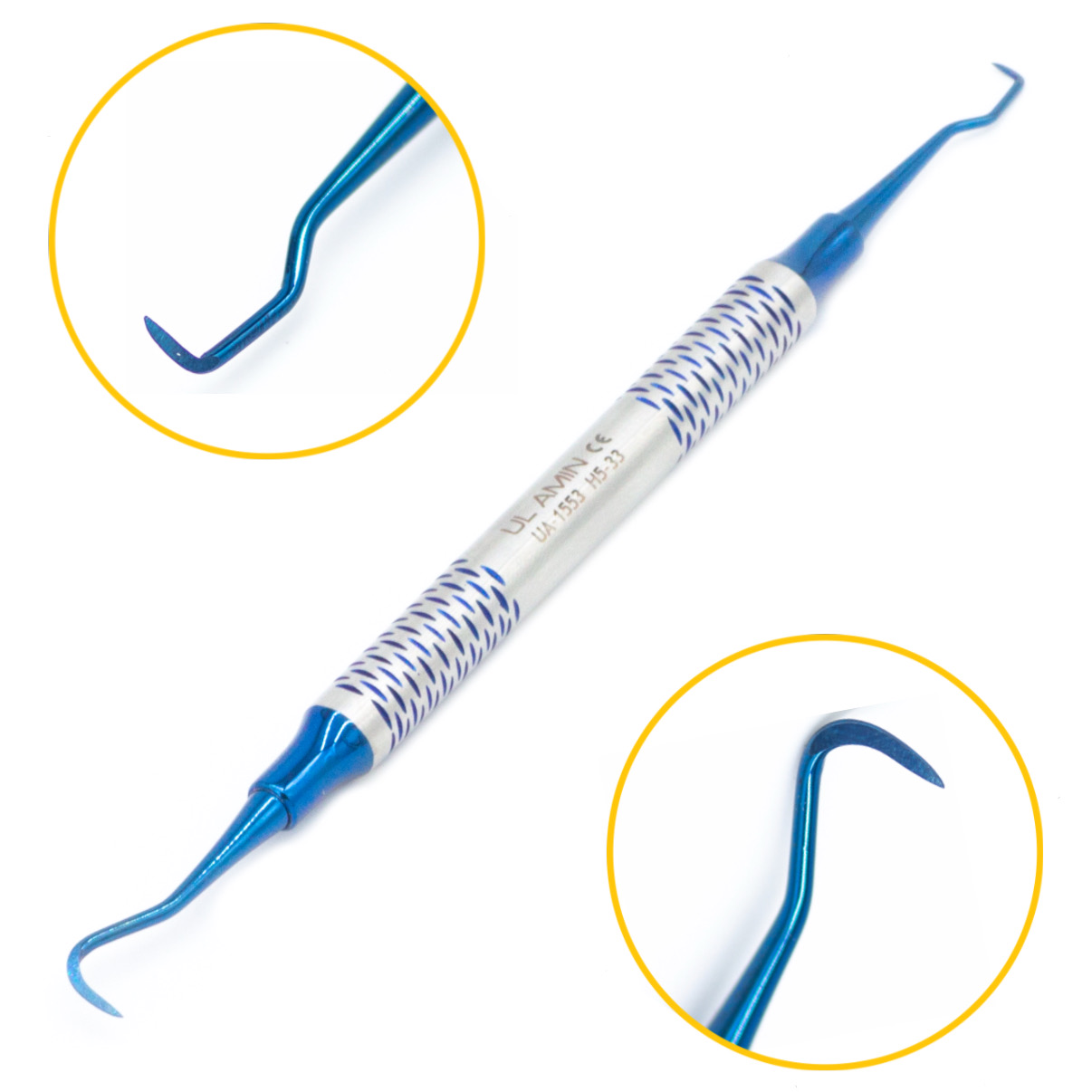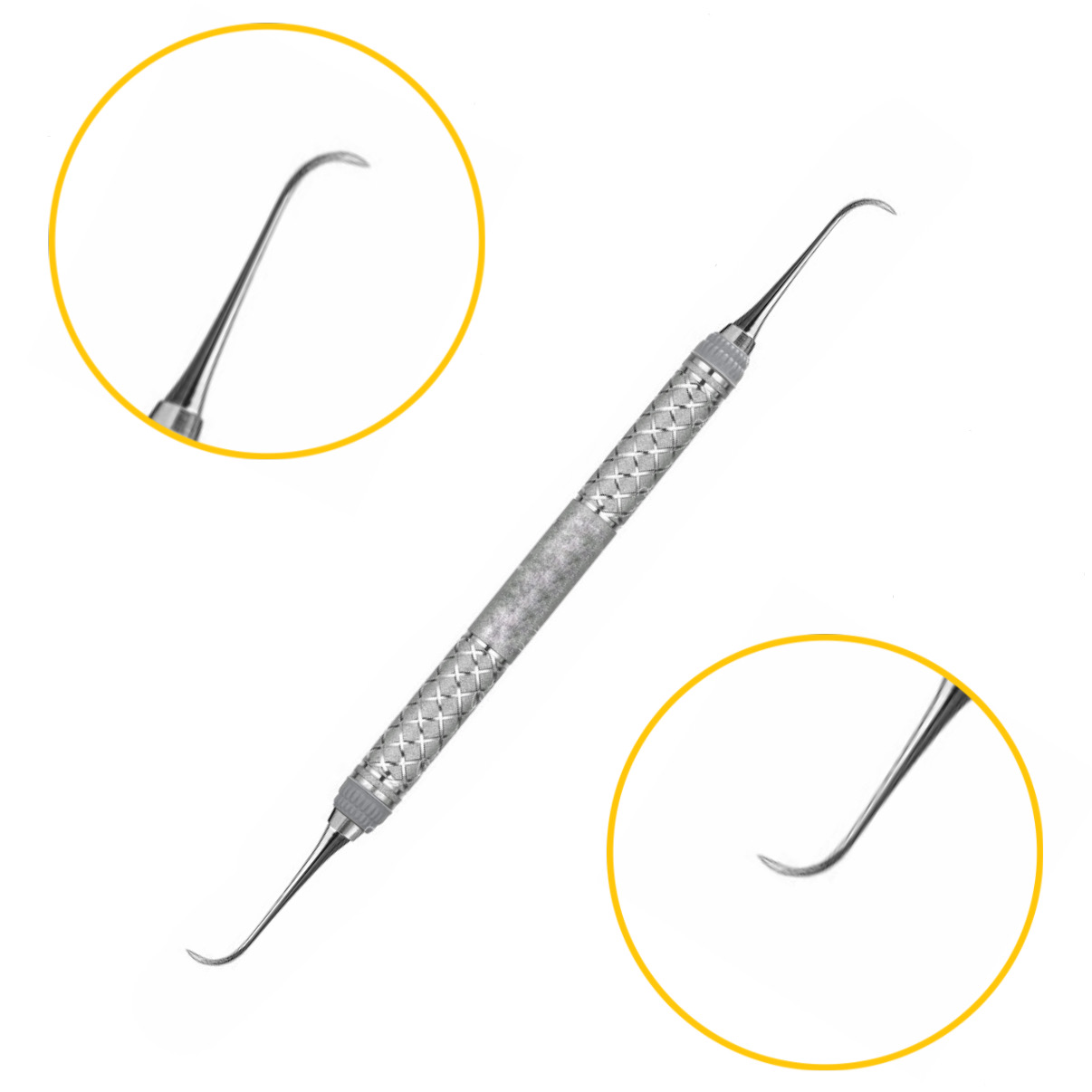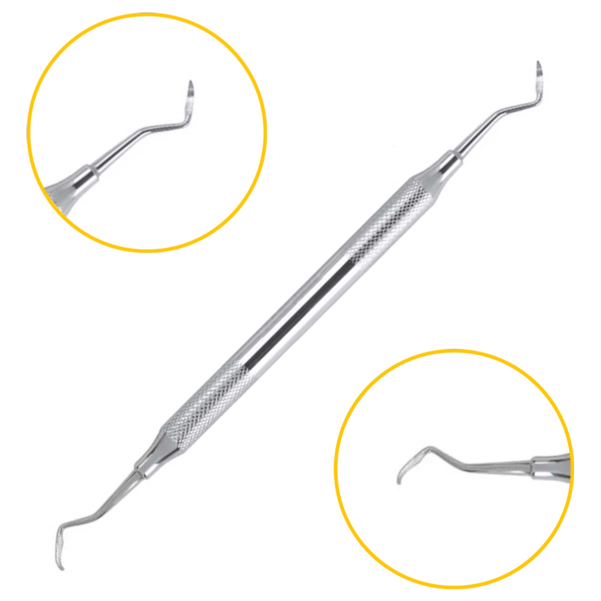Скейлер ручной H5-33 сочетает в себе разные формы рабочих частей. Инструмент предназначен для использования при лоскутных операциях, когда обеспечен открытый доступ к поверхности корня зуба. Первая рабочая часть выполнена в форме серповидного скейлера с острым кончиком и режущими кромками. Вторая имеет анатомические изгибы стержня и заостренную рабочую зону с выраженными гранями для эффективного скалывания отложений. Помимо основной функции, обработки поверхности корня, скейлер можно применять для удаления грануляций и их выскабливания с поверхности кости.