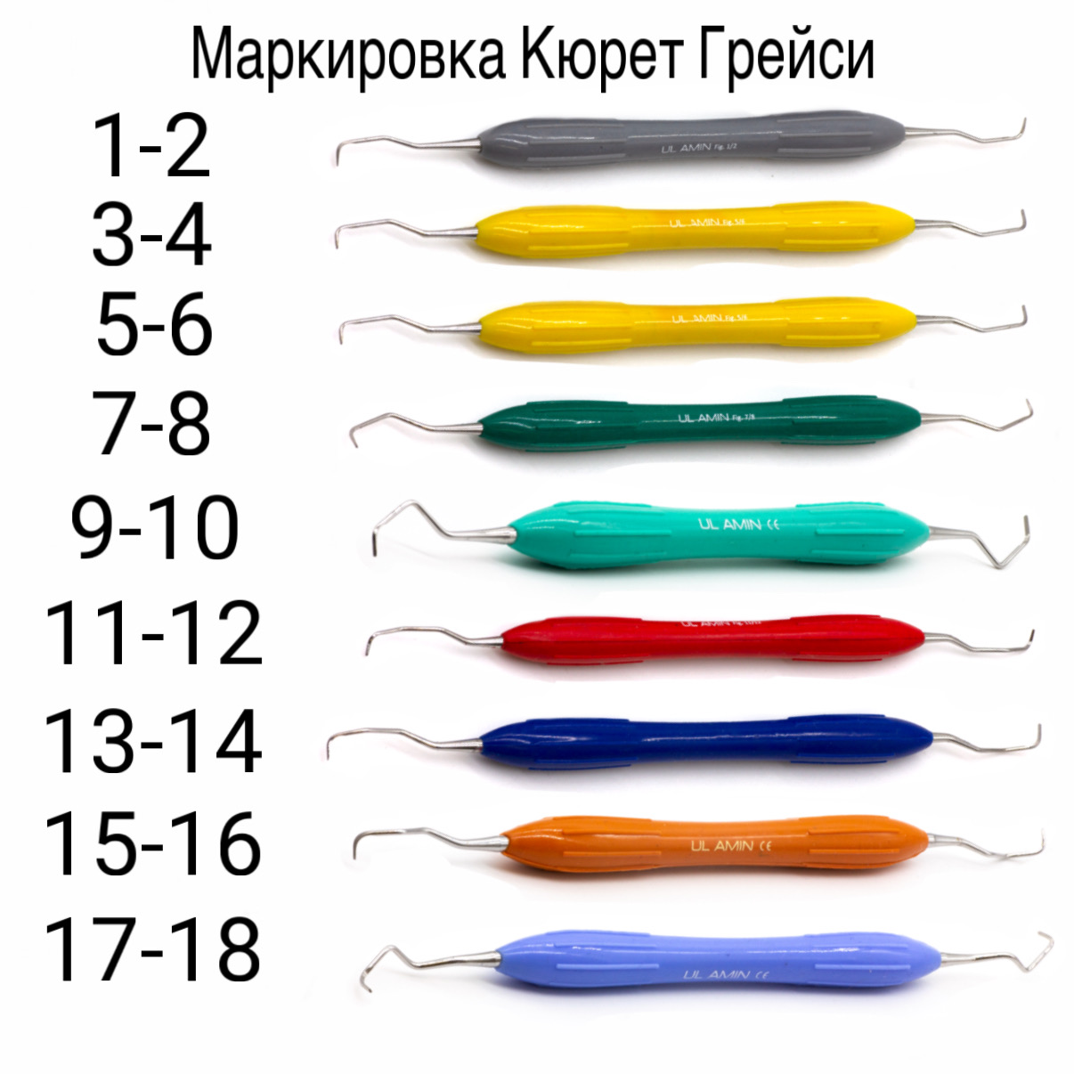 В стоматологической практике каждая кюрета имеет уникальную цифровую маркировку в диапазоне от 1-2 до 17-18. Указанные цифры соответствуют нумерации зубов и квадрантов челюстей. Такая система обозначений упрощает идентификацию инструмента, его поиск и корректное применение при различных клинических вмешательствах.